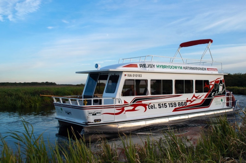 On 16.06.2012 on Krzywe Lake we launched a 14-person catamaran with an electric drive. The boat is driven with a 5KW motor and travels at a speed of 5 knots. It can be run on batteries all day long long. The batteries are additionally charged by three solar panels on the roof.