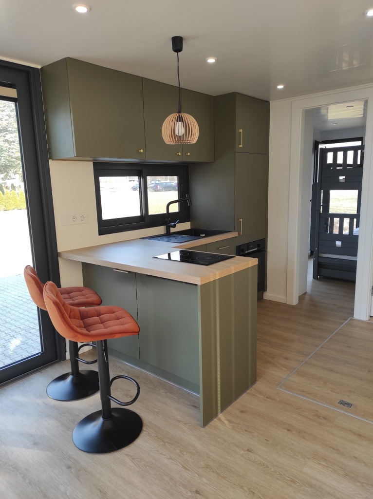 - Kuchnia: Komplet mebli kuchennych (Paleta RAL), lodówka pod blatowa, kuchenka diesel dwu palnikowa, zlewozmywak