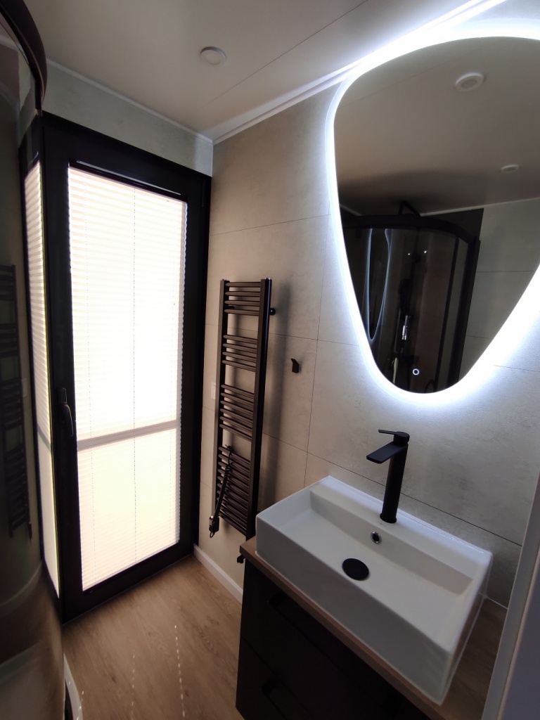 - Łazienka: wyposażona w kabinę prysznicową, toaletę, szafkę z umywalką, lustro